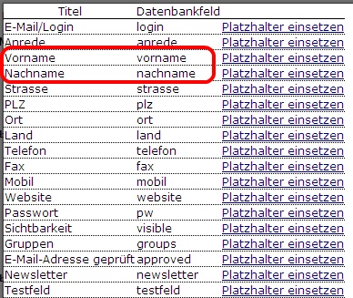 Daraufhin öffnet sich ein Fenster mit allen verfügbaren Platzhaltern. Sinnvoll verwendbar sind bei der Anrede natürlich nur Vorname und Nachname.