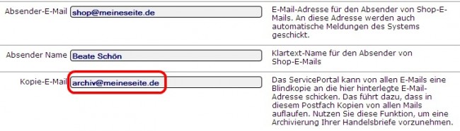 An die zusätzliche Adresse (z.B. archiv@meineseite.de), die Sie im dritten Feld eingeben, verschickt das Service-Portal automatisch Kopien aller E-Mails. Diese Kopien können Sie als Archiv Ihrer geschäftlichen Aktivitäten nutzen.